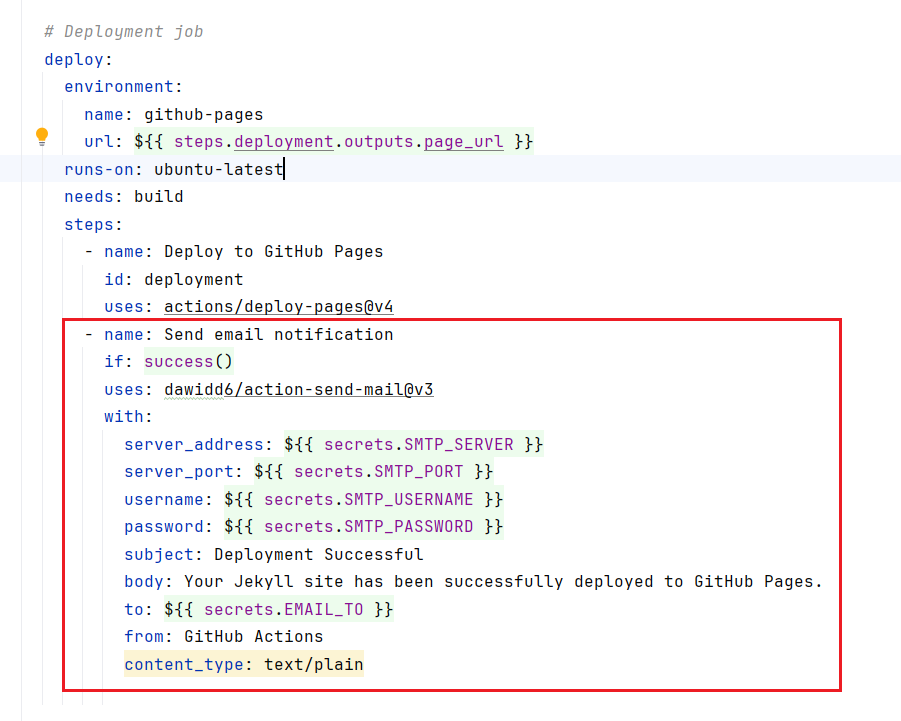 所以解决方案很简单,就是在github actions的workflow脚本中增加邮件通知能力,让本次的编译和部署成功后,调用大佬们编写好的邮件通知action能力发送邮件,具体步骤如下: