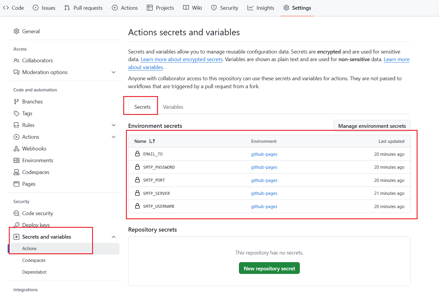 2、这边我们发现敏感的账号密码,在我们的workflow文件中是一个占位符的写法,想想也很合理,毕竟账号密码是属于私密信息,而仓库是public的,万一提交到git上,可能会造成经济损失,这边github很贴心的提供了一个叫secret的功能,如图:
