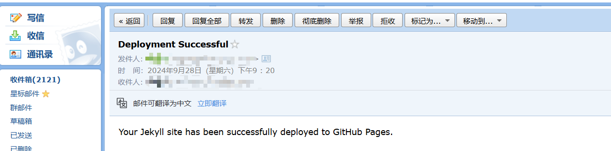 3、我们提交新的workflow文件到github,然后等待邮件通知,果不然大约2分钟我们的邮件就收到了部署成功的通知,如图: