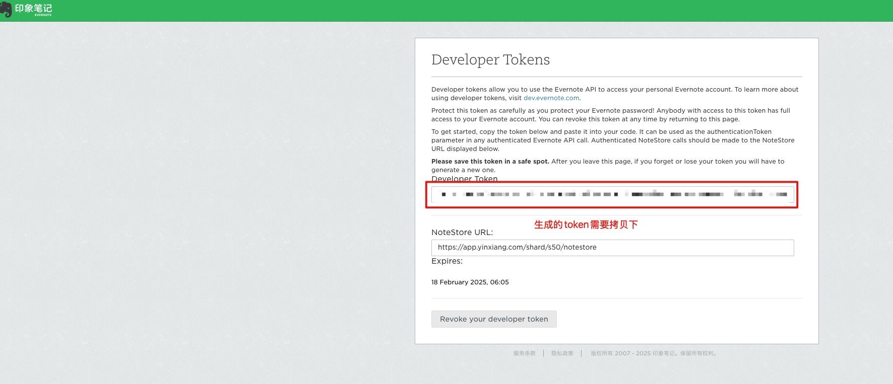 3、创建1个文件夹,在文件夹根目录下执行命令,初始化数据库:evernote-backup init-db --backend china -t yourtoken,其中token需要从印象笔记官网创建,打开网址:https://app.yinxiang.com/api/DeveloperToken.action (需要登录下),根据网页提示创建token,将生成的token拷贝下