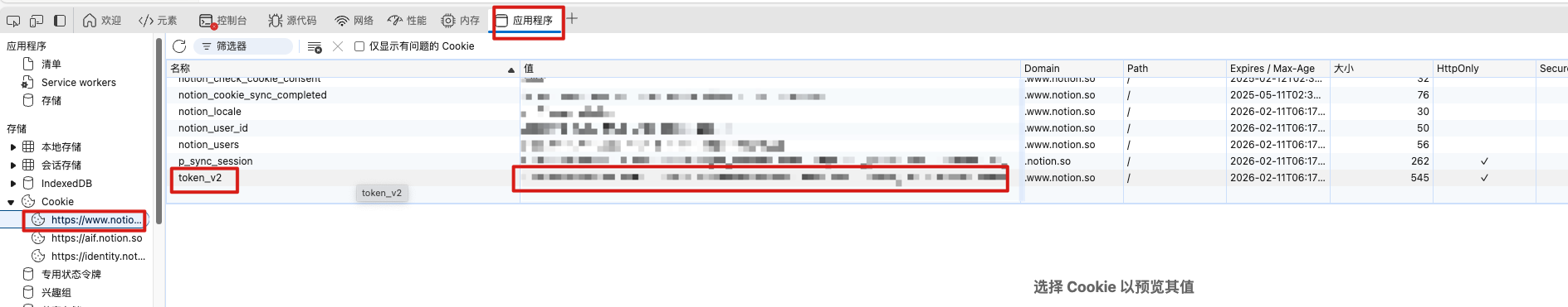 2、在修改了官方库的bug后,我们去notion官网获取下token,打开官网:https://www.notion.so 登录下,然后浏览器f12打开调试控制台,刷新下页面,获取token_v2的值,如图: